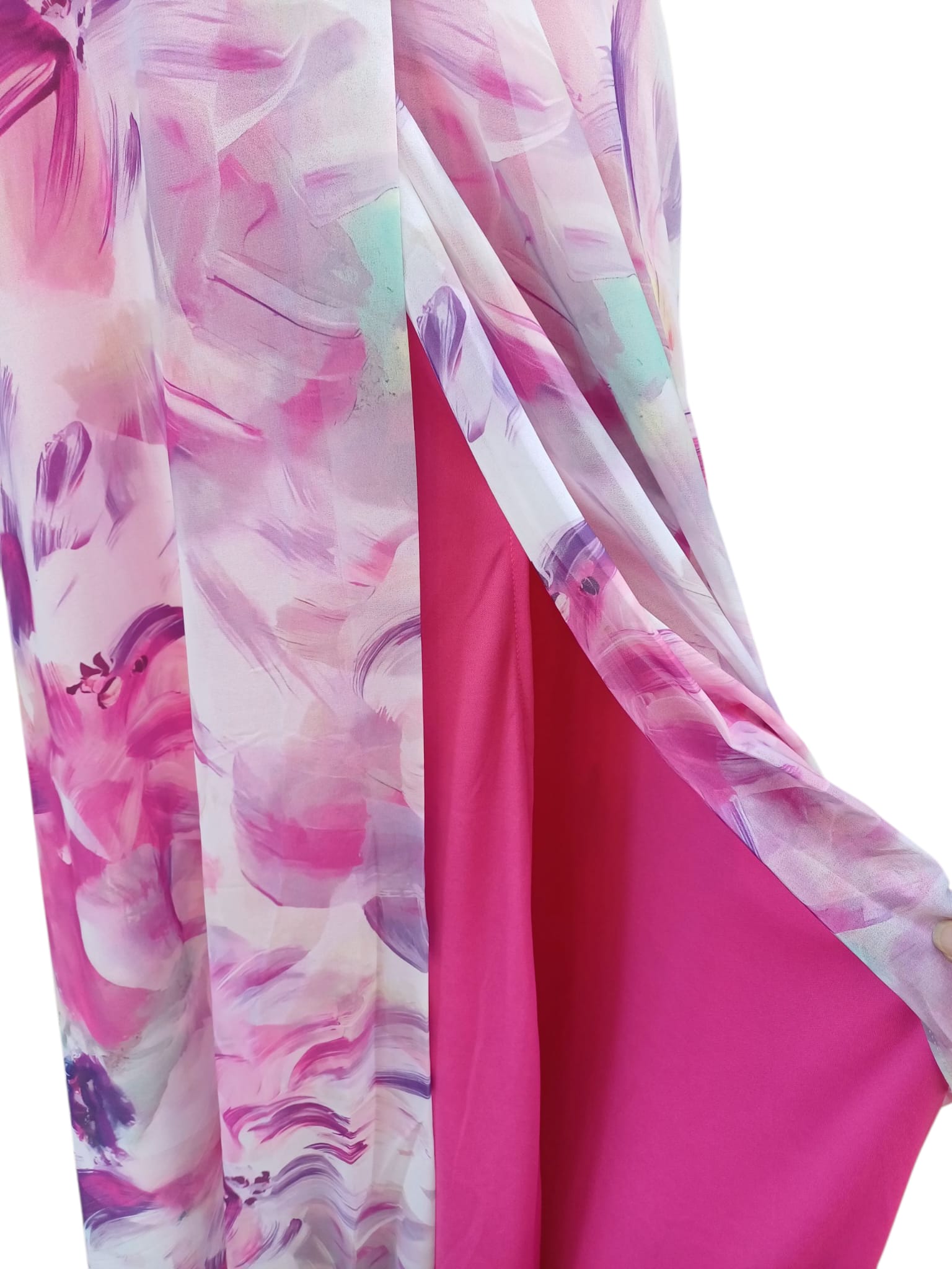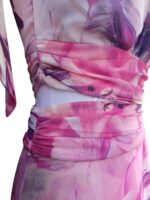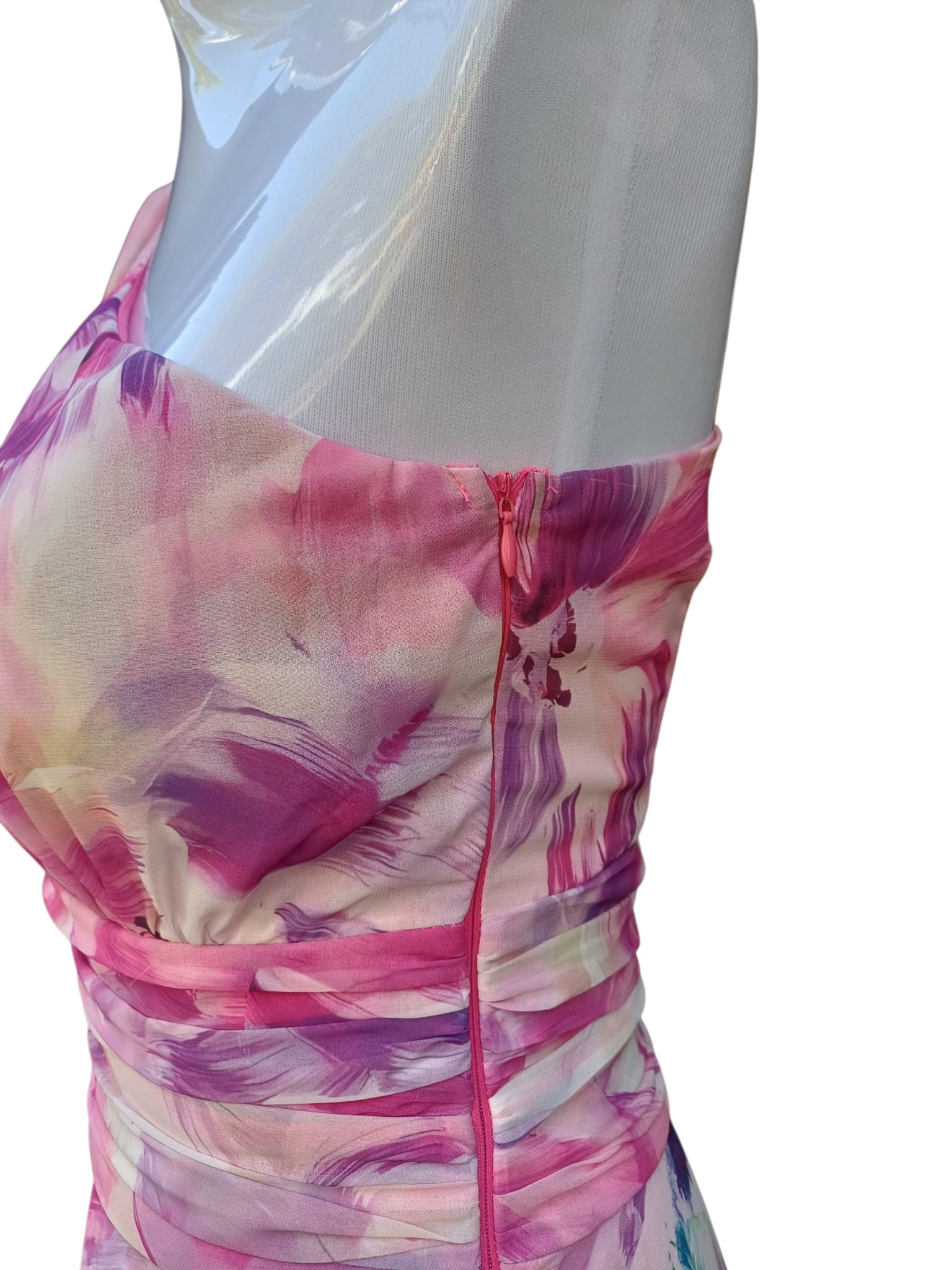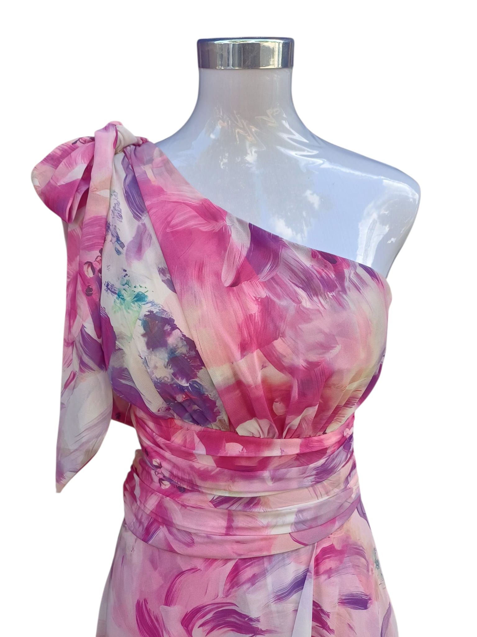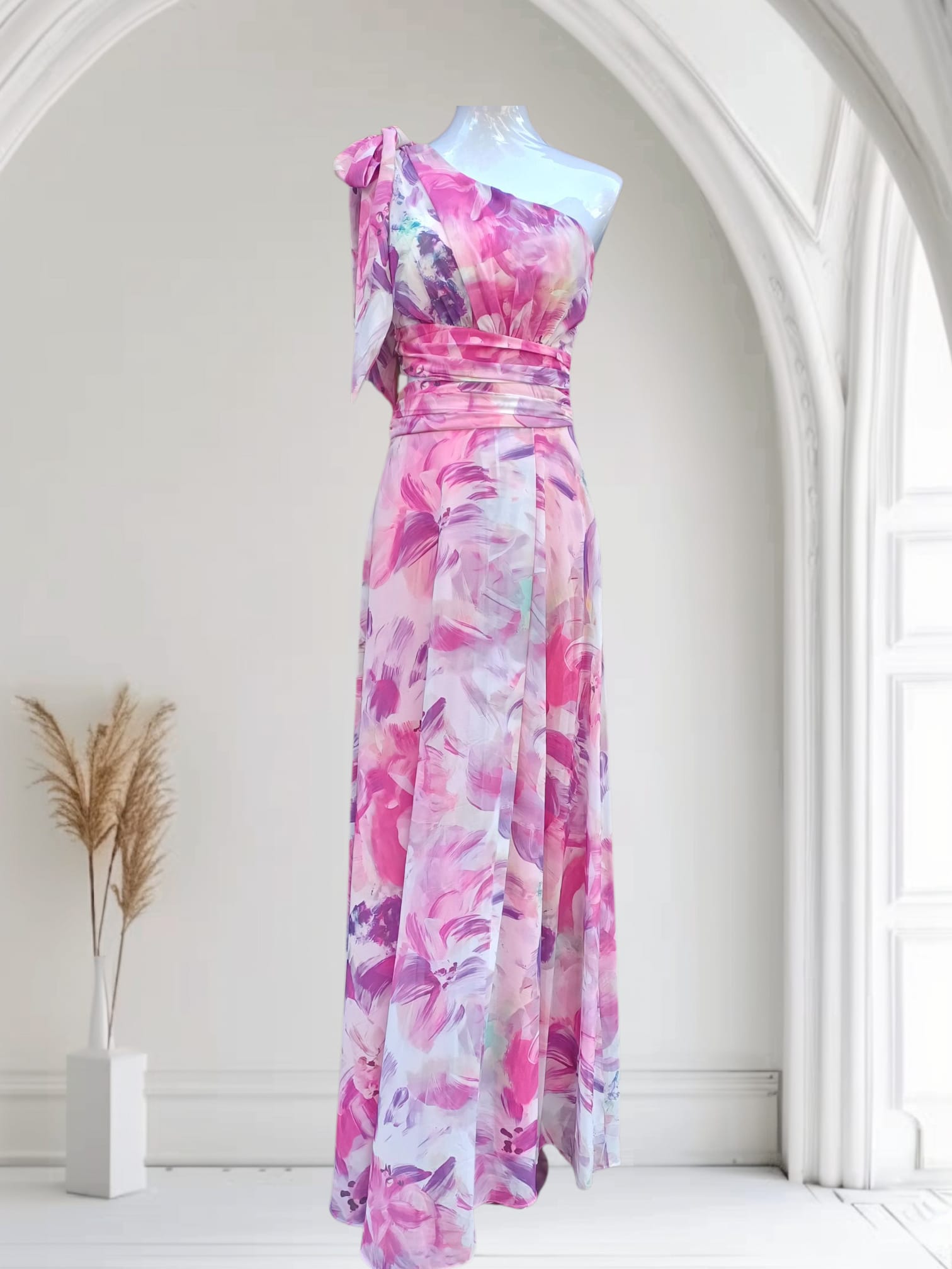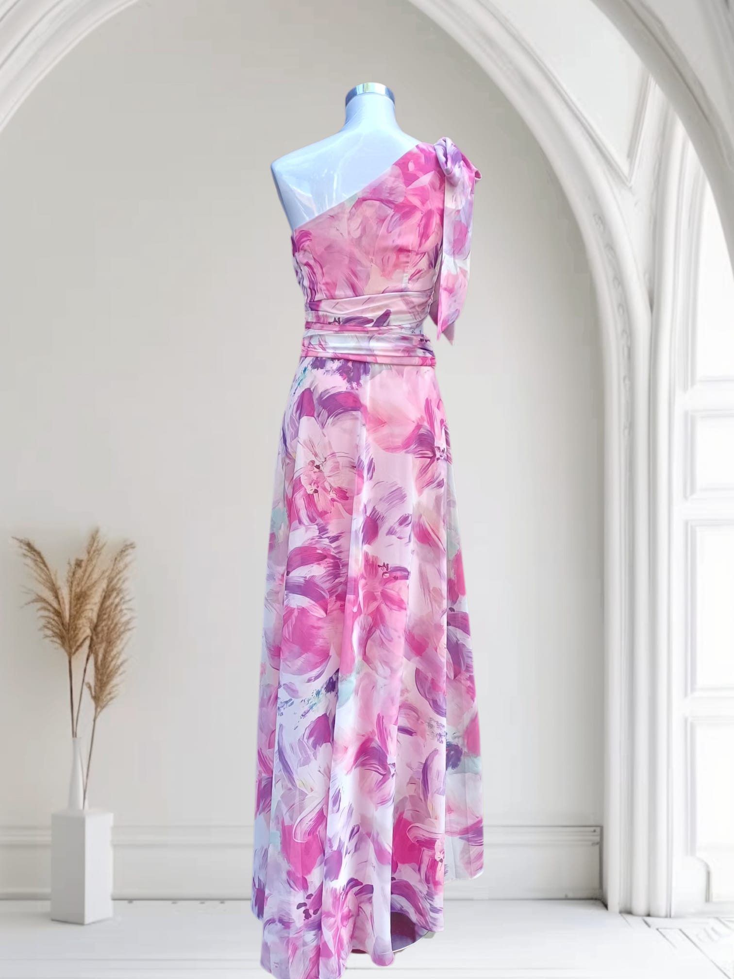 Abito lungo monospalla in chiffon con fantasia floreale nei toni del rosa e del lilla.